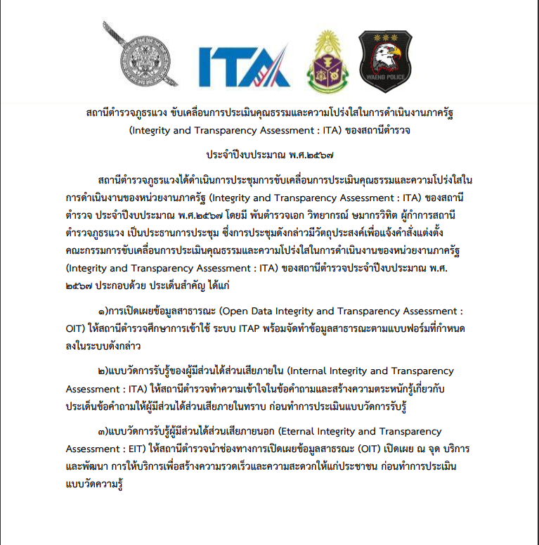 1. ประชุมทำความเข้าใจข้าราชการตำรวจในสังกัด เข้าตอบแบบวัดการรับรู้ของผู้มีส่วนได้ส่วนเสียภายใน(Internal Integrity and Transparency Assessment: IIT)